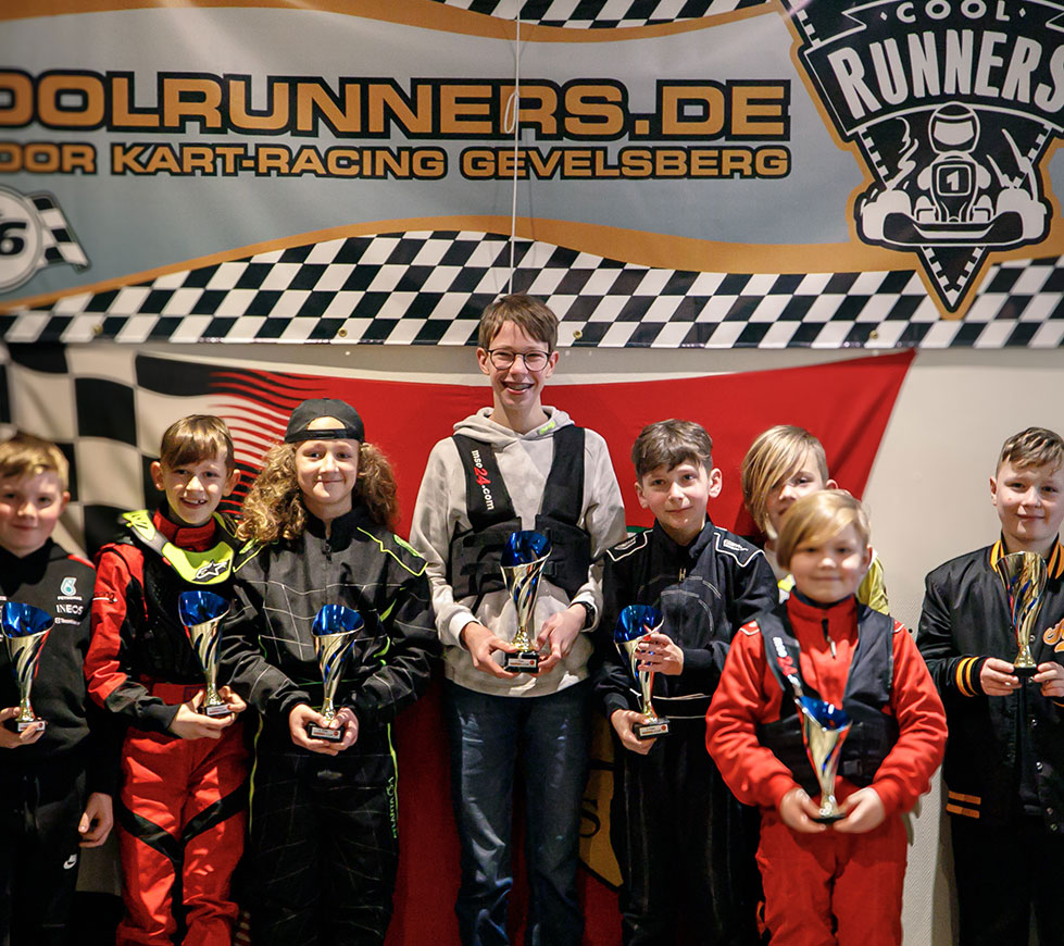 - für 7 Kinder ab acht bis ca 14 Jahren, 3x10 Minuten exklusiv im 5,5PS Kart, eine Sturmhaube für jedes Kind, ebenso ½ Liter-Getränk und am Ende Siegerehrung mit Gold-Medaillen für jedes Kind: ab 265,- bis 295,- €
